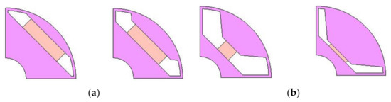 For example, Figure 2a shows rotor designs with wide PMs positioned near the outer diameter of the rotor and slits focusing the PM flux into the air gap. These topologies produce high torque, and thus correspond to positive examples. On the contrary, Figure 2b shows small PMs positioned deep inside the rotor with unrealistically large slits. These topologies produce extremely low torque and are not realistically feasible. As mentioned above, such negative examples are included to teach the DL CNNs the features that lead to low torque, distinguishing them from the ones shown in Figure 2a.