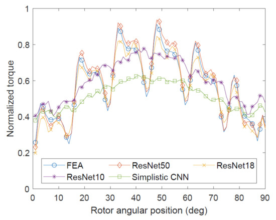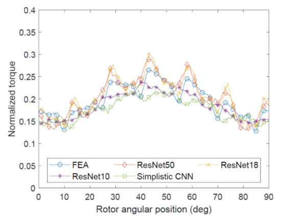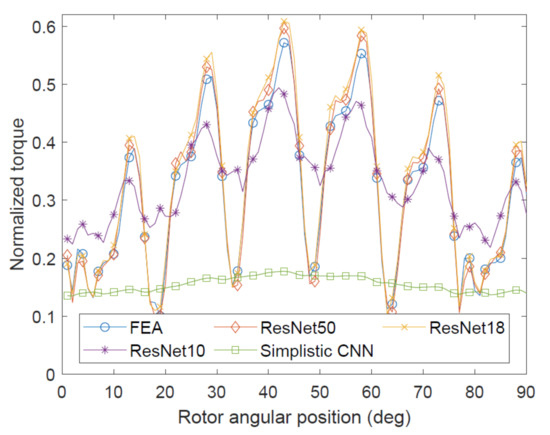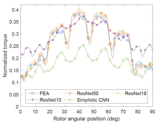 Whereas ResNets show accuracy comparable to FEA, the analysis (torque prediction) time is significantly reduced when using CNNs, as shown by Table 5. Evaluating the complete dataset even with ResNet-50 takes less than 1 min, whereas FEA requires 200 h of computations. Furthermore, the FEA models used in this study were relatively compact, whereas extremely high-accuracy FEA may take up to 1 h per model or even longer, further escalating the difference between FEA and CNN prediction times. However, CNNs can be trained on the data obtained using high-accuracy FEA models, and then reused taking advantage of extremely fast CNN prediction speeds.