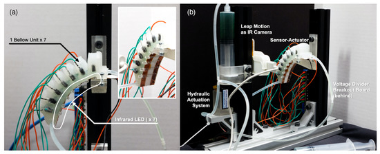 (a): Our soft robotic sensor–actuator in its idle pose. Shown in the inset are the seven infrared LEDs on a copper strip attached to the actuator, which also acts as a strain-limiting layer. (b): The experimental setup with the hydraulic actuation system is shown, along with the Leap Motion infrared camera and breakout board for data acquisition.