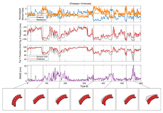 Over our entire test dataset, which spanned 30,000 samples or 10 min, we achieved a root mean square error (RMSE) of 5.85 mm considering the positions of all seven infrared LEDs. Figure 3 shows the entire test dataset along with several snapshots of the actuator’s pose. For simplicity, only the position of the fingertip is plotted, ranging approximately 60 mm in the horizontal (X) direction and 40 mm in the vertical (Y) direction. We observe that the model captured the overall pose of the actuator given sensor inputs throughout the time shown. By inspecting the pose snapshots (Figure 3 below), we see that at moments where the actuator’s tip diverged from the ground truth, the overall pose was still mostly correct. The model also responded well to rapid changes, shown around the 100 to 200 s mark. This result shows that the BiLSTM model generally captured the actuator’s nonlinear response and time-dependent characteristics well. Videos of the resulting poses are available in the Supplementary Materials section.