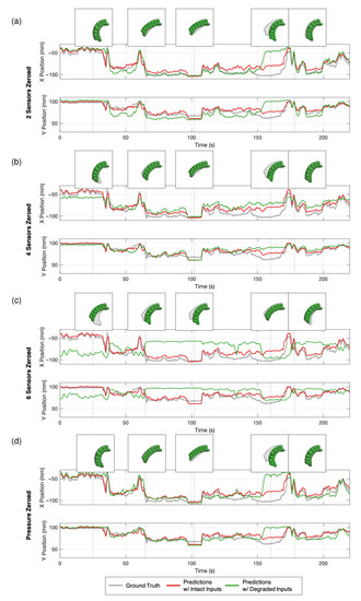 In practice, sensors can degrade over time or fail completely. In biological systems, it is possible to compensate for or adapt to a loss of sensory feedback. Since our sensors may or may not have redundancy, we aimed to investigate the robustness of our BiLSTM model towards the loss of input data. Here, we attempted to artificially degrade the sensors by degrading the inputs from the test dataset and evaluated the resulting predictions from the previously trained model. In Figure 4, we present 4 min excerpts of the resulting outputs of the trained model generated from input data that were gradually degraded by artificially saturating the inputs in turn. We saturated the sensors by setting the entire duration of the sensor’s input to zero before z-score normalization. In the first case, we completely saturated the first two resistance-based sensors near the tip. The plot shows that, in general, the model still performed well. In the case with four sensors saturated, the model still predicted the movement well, but with an expected overall decrease in accuracy. However, with six sensors saturated, or with only the pressure readings intact, the model performed extremely poorly. It is notable that some dynamics were still captured using pressure alone, suggesting that the model leverages pressure readings to some extent. Conversely, with only the pressure readings removed and leaving all other sensors intact, the model performed considerably well. Arguably, this result shows that the input data may not be redundant after all, but this is difficult to determine due to the black-box nature of neural networks.