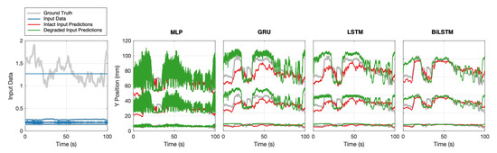 In this section, we show how our hybrid sensor–actuator can provide rich and informative signals that can be interpreted by learned models. The models were capable of creating reasonable estimates of the positions of the LEDs given time series of sensor data. After training our BiLSTM model, we used it to create time series predictions using our test data as the input. The test data were z-score normalized using the mean and variance for each input from the training data. We describe the preferred estimator’s performance in achieving state estimation, examine how sensor degradation affected that performance and compare how different machine learning model choices behaved under sensor degradation.