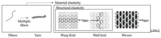 The textile is the energy storage medium and fulfills the functions of a spring via the adjustable elastic properties. The energy storage capacity can be achieved either by the yarn material used (fibers) on the material side or by the connection of the individual yarns, i.e., structurally (Figure 1).