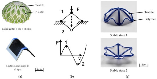 In this process, the textile forms double-curved surfaces, which represent the lowest possible energy level. Depending on whether the circumference of the structure can decrease when the pre-stress is released or is prevented from doing so by the reinforcements, synclastic, dome-shaped surfaces or anticlastic saddle surfaces are formed (Figure 2). Influenced by the stiffness of the chosen material, the reinforcements have either curved—in the case of an elastic material—or straight shapes [43]. In addition, the tensions cause 4D textiles to form more than one equilibrium state, enabling a shape change. By applying an initial force, the structures can thus switch between two or more metastable states (Figure 2).