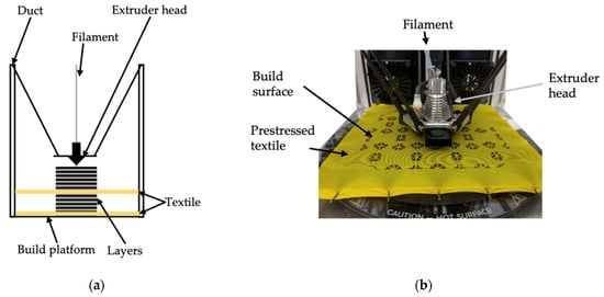 The polymer is then extruded on the textile through the nozzle. To create multilayer structures, more than one textile layer can be integrated in the process [10,25]. To produce these structures, it is necessary to pause the printing process at the time another textile layer needs to be added [10]. The process is shown in Figure 3. The melted material is introduced into the surface pores of the textile. As soon as the additive has hardened, a form–closure connection is created.