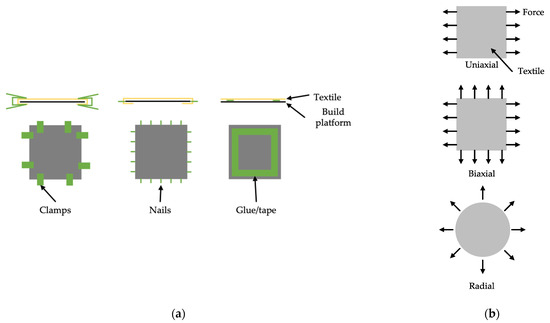 Four-dimensional textiles are hybrid systems consisting of a minimum of two materials which are additively combined. For 3D printing on textiles, material extrusion processes are mainly used [4]. Therefore, the textile is placed on the build plate and can be considered the new build surface. The process is shown in Figure 3. To store energy, it needs to be pre-stressed and the build plate needs an additional stretching unit. Different approaches have been applied: to fix the textile in the print bed, a double-sided adhesive tape can be used [31]. The disadvantage of this method is the lack of exact repeatability of the process. Alternatively, a tension board with nails or a tension bed for stretching the textile can be used [25]. A disadvantage is the damage to the textile caused by the nails. This is solved when using clamps to pre-stress the textile with having less accuracy [32]. Other methods used are glue and double-sided tape [40]. The textile can be either pre-stressed biaxially or uniaxially. Rivera et al. seemed to pre-stress radially but did not mention it explicitly [10]. Different stretching methods are shown in Figure 4.