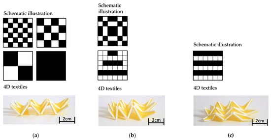 - Schmelzeisen, D.; Koch, H.; Pastore, C.; Gries, T. 4D Textiles: Hybrid Textile Structures that Can Change Structural Form with Time by 3D Printing. Narrow Smart Text. 2017, 189–201. [Google Scholar] [CrossRef]