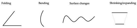 The change in shape can be divided into the following behaviors: folding, bending, surface changes and shrinking or expanding (Figure 7). These behaviors can be referred to the behavior of actuators as described by Persson et al. [2].