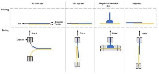 Different testing methods can be applied: Sanatgar et al. combined a sampling method with the standard peeling method SS-EN ISO 11,339:2010 using a Zwick/Z010 tensile tester to investigate the dependencies for 3D printing on textiles [48]. Korger et al. used an adhesion test according to DIN 53,530 which is usually applied for testing the separating layers of laminated woven fabrics [33]. Narula et al. identified the ASTM D5170 testing method for hook and loop material as the most appropriate [35]. They argued that the method used by Korger et al. is appropriate for woven structures but the pull-out of the polymer “pins” in knitted structures interferes with the results. Malengier et al. proposed a perpendicular tensile test as best suited for the adhesion test [40]. Therefore, a pawn-shaped object is directly printed on the textile. The maximum force to detach the object from the textile was measured. Additionally, they applied a shear test (EN1373) with a rectangular plate printed on the textile and a peel test for six different woven fabrics. A T-peel adhesion test was considered appropriate for 3D printing on woven fabric [41]. Optical analysis was used to investigate the necessary pore geometry of the textile substrate in relation to the adhesion [35]. In Figure 8, different preparation and testing methods are shown.