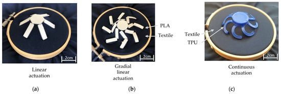 Buttons, clamped in embroidery hoops after printing, as actuators made with 4D textiles: (a) linear actuation; (b) gradual linear actuation; (c) continuous actuation.