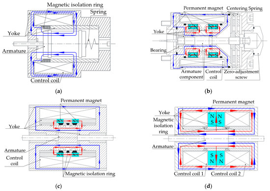 Four different magnetic circuit topologies. (a) The proportional solenoid; (b) Moog’s LFM; (c) Li’s LFM; (d) Ding’s LFM.