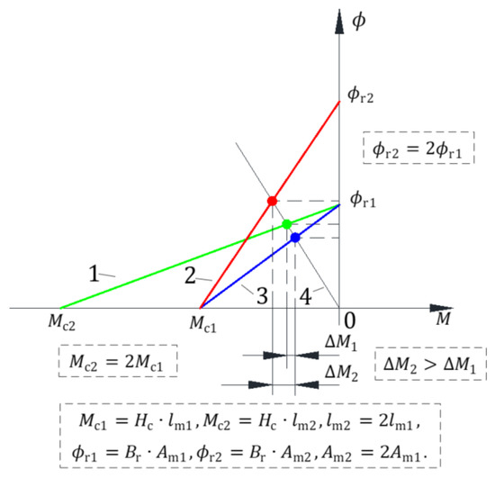 Rare-earth permanent magnets are non-renewable strategic resources [26,27], and some permanent magnets such as samarium cobalt permanent magnets are relatively expensive. Therefore, they possess important economic implications for improving the energy utilization of permanent magnets, especially for large-scale applications like valve electro-mechanical converters. Figure 2 shows the schematic diagram of the magnetic potential contribution to the external magnetic circuit of permanent magnets. Curves 1, 2, and 3 are the demagnetization curves of permanent magnet A, permanent magnet B, and permanent magnet C, respectively, and curve 4 is the load curve of the external magnetic circuit; lm1 is the length of permanent magnet B and permanent magnet C in the magnetizing direction; lm2 is the length of permanent magnet A in the magnetizing direction; Am1 is the cross-section area of permanent magnet A and permanent magnet B; Am2 is the cross-section area of permanent magnet C; Mc1 is the magnetic potential of permanent magnet B and permanent magnet C; Mc2 is the magnetic potential of permanent magnet A. Although the length of permanent magnet A along the magnetization direction is twice as long as that of permanent magnet B, the magnetic potential contributed to the external magnetic circuit only increases by ∆M1. In addition, the cross-section area of permanent magnet C is twice as much as permanent magnet B, and the magnetic potential contributed to the external magnetic circuit increases by ∆M2. Obviously, ∆M2 is greater than ∆M1. This is because, when the length of the permanent magnet in the magnetizing direction increases, not only does the magnetic potential provided to the external magnetic circuit increase, but also the magnetic reluctance increases proportionally; when the cross-section area of the permanent magnet increases, although the magnetic potential provided to the external magnetic circuit does not change, the magnetic resistance decreases significantly. In addition, modern electro-mechanical converters generally work with very small air gaps, which brings about a steep slope of the load curve, as shown in Figure 2. This indicates that, in order to improve magnetic energy utilization and save materials, the permanent magnet should be designed as a flat shape with a larger cross-section area, where the dimension in the magnetizing direction shall be as small as possible.
