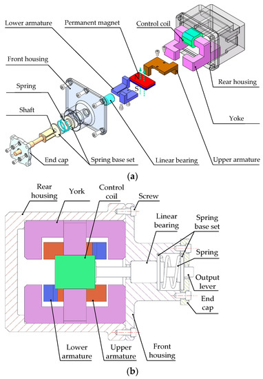 Figure 3 shows the structural configuration of the NLFM, which is composed of the yoke component and armature component. The yoke component is a holistic truss structure with an excitation coil wound around its middle beam. The armature component is composed of a permanent magnet and two claw-pole-shaped armatures. To improve energy utilization, the permanent magnet is designed as a flat rectangular structure where the magnetizing direction coincides with its height direction. Thus, the dimension in the magnetizing direction can be kept as small as possible. Each armature has two pole shoes. The permanent magnet is embedded between the upper and low armatures to form the armature component, where the four pole shoes are distributed at 90° diagonally apart. One end of the shaft is fixed between the permanent magnet and two armatures, and the other end is inserted into a linear bearing. The spring is used to convert the output force into linear displacement.