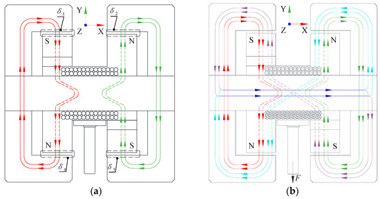 Figure 4 shows the magnetic circuit topology of the NLFM, where the magnetizing direction of the permanent magnet is the positive direction of the Z axis. The permanent magnet magnetizes the upper and lower armatures as the N pole and S pole, respectively. Four working air gaps of the same length, , , and , are formed between the armature component and the yoke. When the control coil is de-energized, the armature is in the initial equilibrium position, and the lengths of the four air gaps are equal, as shown in Figure 4a. When the control coil is energized, the control flux generated by the coil and the polarized flux produced by the permanent magnet start to interact, where the magnetic flux of and is superposed and therefore enhanced, and the magnetic flux of and is neutralized and thus weakens. This causes the NLFM to generate a downward electromagnetic output force whose magnitude and direction can be adjusted by controlling the current, as shown in the Figure 4b.