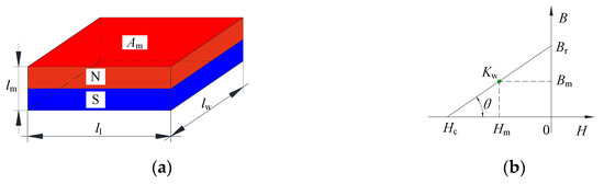 Figure 5 shows the schematic of the permanent magnet and its demagnetization curve, respectively, where is the flat surface area of the permanent magnet; is the length of the magnetization direction; the line is the demagnetization curve of permanent magnet; is the operating point on the permanent magnet demagnetization curve; the slope of the demagnetization curve represents the permeability ; is the coercive force; is the residual magnetic flux density. Figure 6 shows the equivalent magnetic circuit model of the permanent magnet, where is the internal magnetic reluctance of the permanent magnet; is the magnetic flux generated by the permanent magnet; is the magnetic potential generated by the permanent magnet; is the magnetic potential provided to the external magnetic circuit, namely the polarized magnetic potential.