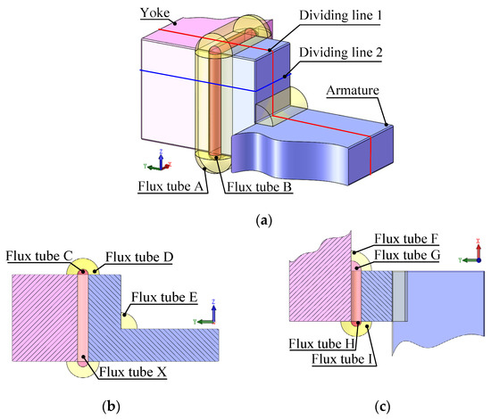 The reluctance of the working air gap has a crucial influence on the calculation accuracy of the entire magnetic field of NLFM. When the magnetic flux flows through the air gaps, it will diffuse. Such phenomena can be called edge effects. When the length of the air gap increases, the ratio of the diffused magnetic flux to the total air gap magnetic flux will also increase, and its influence cannot be ignored. According to the distribution of the air gap magnetic fields between the poles of yoke and armatures, the entire air gap magnetic field can be segmented into several magnetic flux tubes [28], as shown in Figure 7, where the Ra–Ri are reluctances of diffused flux tubes, and the Rx is the reluctance of main flux tubes. The reluctance of these flux tubes can be calculated by the relevant formulas listed in Table 1.