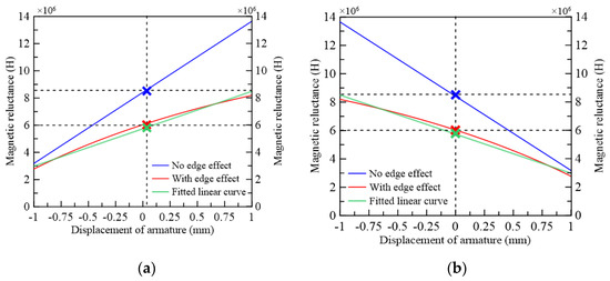 The variation of air gap magnetic reluctance with armature displacement. (a) , . (b) , .