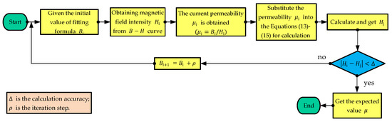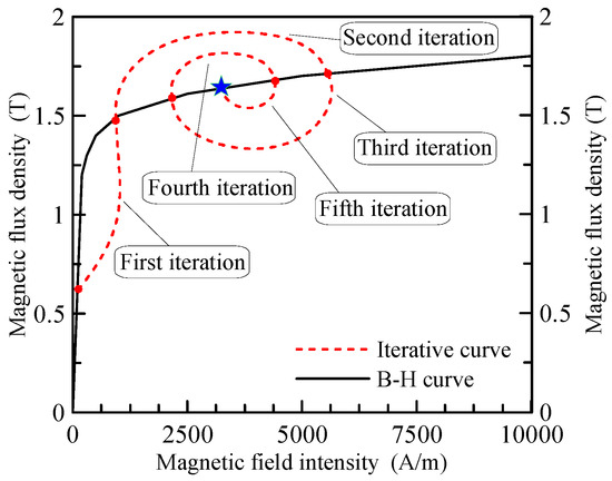 Both the armature and the yoke of NLFM are made of soft magnetic material DT4, whose permeability will vary with the magnetic flux density B. This leads to a nonlinear relationship between B and H, as shown in Figure 10. Therefore, in order to obtain a high-accuracy analytical model, the nonlinearity of permeability must be taken into account. According to the B-H curve of DT4 and Equation (14), the non-linear value of is iteratively calculated, as shown in Figure 11.
