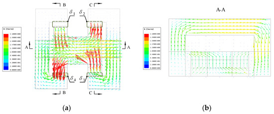 Though computationally expensive, the finite element method can directly calculate the magnetic field accurately and provide an in-depth understanding of the magnetic field distribution. In this paper, it is employed to validate the analytical model of the NLFM. The FEM model of NLFM is established using electromagnetic-field finite-element software Ansoft Maxwell. Figure 12 shows the simulated magnetic field vector diagram of NLFM with a current of 1 A and armature displacement of 1.4 mm. When the control coil is energized, the control flux generated by the coil and the polarized flux produced by the permanent magnet begin to interact, where the magnetic flux of and is superposed and enhanced, and the magnetic flux of and is neutralized and thus weakens. Therefore, a downward electromagnetic force is generated. The results of the finite-element simulation are consistent with the working principle of Section 3. In addition, the diffusion phenomenon arises when the magnetic flux enters the air gap from the end face of the magnetic pole. Therefore, the edge effect must be taken into account in the calculation of the reluctance.