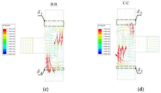 The magnetic field vector diagram of NLFM. (a) vertical view. (b) A-A section view. (c) B-B section view. (d) C-C section view.