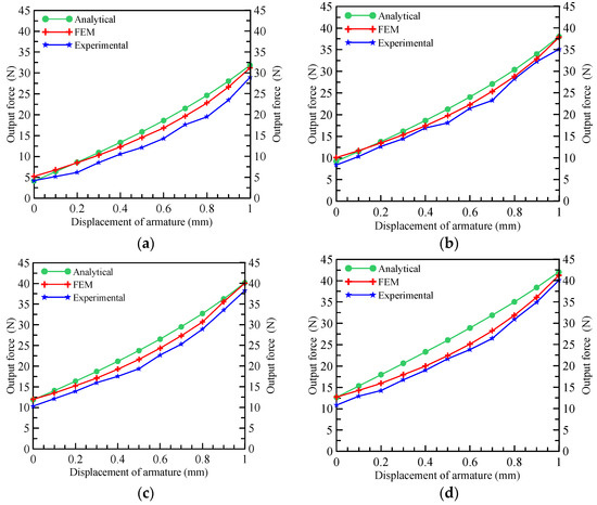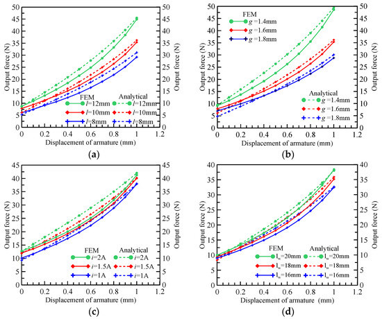 Some key parameters have a significant influence on the performance of NLFM. In this paper, four parameters, namely, the width of rectangular pole shoe l, the length of working air gap g, the coil current I, and the width of permanent magnet lw, are selected to perform parametric design based on both analytical modeling and FEM simulation. It can be seen that the FEM simulated results are quite close to the analytical ones, which verifies the correctness of the analytical model. Varying l actually changes the effective area of the working air gap. Figure 14a shows the influence of l on force-displacement characteristics. The output force increases with the increase of l, which means l should be as large as possible. Figure 14b shows the influence of g on the force-displacement characteristics. Relatively speaking, reducing g is very effective since it can greatly increase the output force. However, the slope of the curve will become steeper, and the working stroke of the NLFM will be limited if g is too small. This indicates that the working stability needs to be considered and the choice of g needs to be compromised. Figure 14c shows the influence of i on force-displacement characteristics. The output force can be increased by properly increasing i. The force increased from 1 A to 1.5 A is greater than the counterpart increased from 1.5 A to 2 A, which indicates that the magnetic field of the NLFM is gradually saturated, and such a trend is demonstrated more clearly through the FEM simulation. Besides, a large current would also result in a heating dissipation problem. Figure 14d shows the influence of lw on force-displacement characteristics. An increase of lw will slightly increase the output force. However, this would also increase the size of the armature, which indicates that a proper compromise also needs to be made.