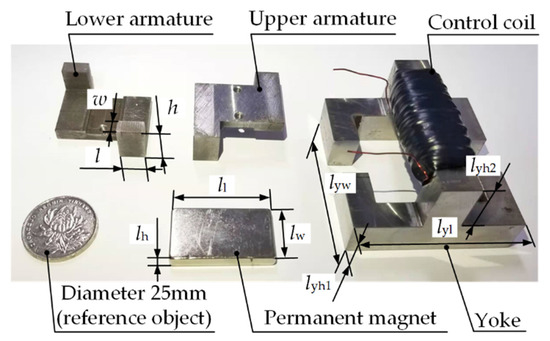 where is the length of the armature claw; is the length of the armature’s main plane; is the total length of the yoke; is the magnetic permeability of soft magnetic material of the armature and yoke; is the area of the magnetic pole face of the armature claw; is the contact area between the armature’s main plane and the permanent magnet; is the cross-sectional area of the armature along the vertical magnetic flux direction.