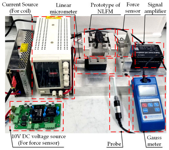 Based on the analytical modelling and FEM simulation, the key structural parameters and material of NLFM are determined, as shown in Table 3, Table 4, Table 5 and Table 6. Then, a prototype of NLFM is designed and manufactured, as shown in Figure 15. A special experimental platform for static characteristics of NLFM is also designed and built, as shown in Figure 16. The experimental platform mainly consists of a signal amplifier, voltage source, linear micrometer, gauss probe, force sensor, and current source. The yoke of the prototype is fixed on a linear micrometer, whose measuring range is from –30 mm to 30 mm with an accuracy of 0.01 mm, and its output shaft is connected with the force sensor. By manually adjusting the linear micrometer, the yoke can move axially relative to the armature, and its displacement can be recorded. The output force can be measured by the force sensor. In this way, the force-displacement characteristics can be obtained. Besides, the gauss meter is used to measure the magnetic flux density by inserting its probe into the working air gap of the NLFM.