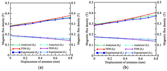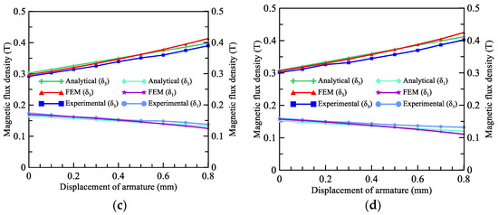 According to Equation (14) and the diagram of the equivalent magnetic circuit (Figure 9), it can be seen that when the coil is not energized, the armature is in the middle position, and the magnetic flux of the working air gap can be written as