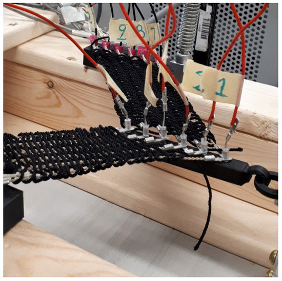 The full actuation module was constructed by stringing a number of pairs of TCAs (dependent on experiment) between rigid side tendons and a rigid central tendon, with a small amount of tension applied to keep the TCAs taut. To keep the TCAs attached, pins were embedded within the tendons and the TCAs were slid over them. Then, purpose-built 3D printed caps were slid over the pins in order to keep the TCAs attached while allowing for rotation. After doing this, thermocouples were fed through retaining slots, which were constructed as part of the pin caps, and attached to the TCAs at a distance of 2 cm from the end of the thermocouple guide. They were tied to the TCAs with nylon thread underneath their weld bead, snugly affixing them to the actuating fibres (see Figure 2). Thermal paste (Halzniye 510) was then applied liberally to eliminate air gaps between the thermocouples and the TCAs, to improve the thermal conductivity and electrical insulation between the two components. Once the thermal paste had been applied, the actuator was woven using 100% nylon 18 weight yarn (Annie’s Catalog 1005019) using a standard over–under manual weaving technique. This was done by attaching the yarn to a weaving needle, and manually passing it through each TCA, passing the yarn over, then under, each successive TCA. The needle was then turned around, and passed through the TCAs again in the opposite direction, going over each TCA where it had gone under the previous pass, and vice versa, to create a loop encompassing each TCA. Each pass, the yarn loops were compressed against one another to make the weave as tight as possible. This weaving procedure continued until the thermocouples attached to the TCAs had been covered by a minimum of three loops, and then was repeated on the other side to complete the mesh. An actuator in the process of being woven can be seen in Figure 3. Upon completion of both sides, the side tendons were adjusted to ensure a 45° pennation angle between the central tendon and the TCA fibres, after which the actuator was considered fabricated and ready for experimentation, as seen in Figure 4.