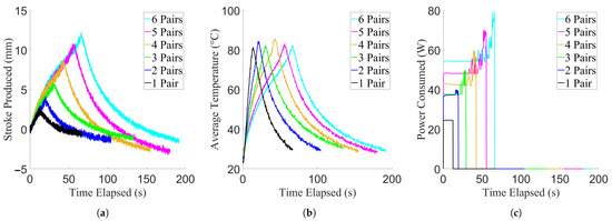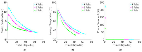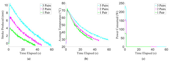 Results of the minimum contraction period experiment, showing data from example trials. For the purpose of clarity, example curves were used due to low variance between trials. (a) Stroke production of the actuator. (b) Temperature achieved by the actuator. (c) Power consumed by the actuator.