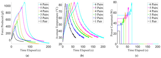 Once they achieved this temperature, the power was cut off to allow them to cool to a temperature of 30 °C. After cooling to this point, the trial was considered complete, and the process would begin again with another randomly selected pair of TCAs. Throughout the trial, the TCA temperatures, power consumed (Texas Instruments INA219B), the distance of the weights from the ground, and time elapsed were logged using a microcontroller (Espressif ESP32) at a sampling rate of 0.11 s, with the limiting speed factor being the communications between the thermocouple amplifiers (Maxim IC MAX6675) and the microcontroller. This was repeated for a total of five trials for that actuator at that activation level.