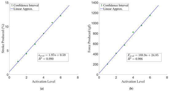 Maximum actuator production per active pairs of TCAs, with overlaid linear regressions. The variable n denotes the number of activated pairs of TCAs. (a) Stroke production results. (b) Force production results.