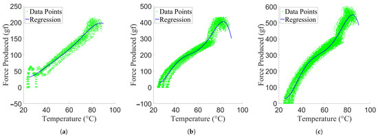 Regressed temperature–force relationships overlaid over experimental data, separated by activation level. (a) One activated pair. (b) Two activated pairs. (c) Three activated pairs.