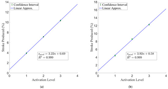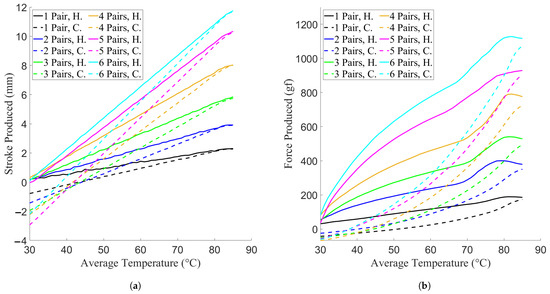 However, it should be noted that the actuators did not perform the same in contraction and relaxation. From Figure 7 and Figure 8 it can be seen that slack was introduced into the actuators during the relaxation phase, with both the force and stroke produced decreasing below the origin point. This is indicative of non-linearities present in the stroke and force production of the system due to hysteresis. To quantify this effect, the average stroke and force production at each temperature point for each activation level was found and averaged across each trial, to give one average temperature–stroke and temperature–force curve for each activation level. These curves can be seen in Figure 12.