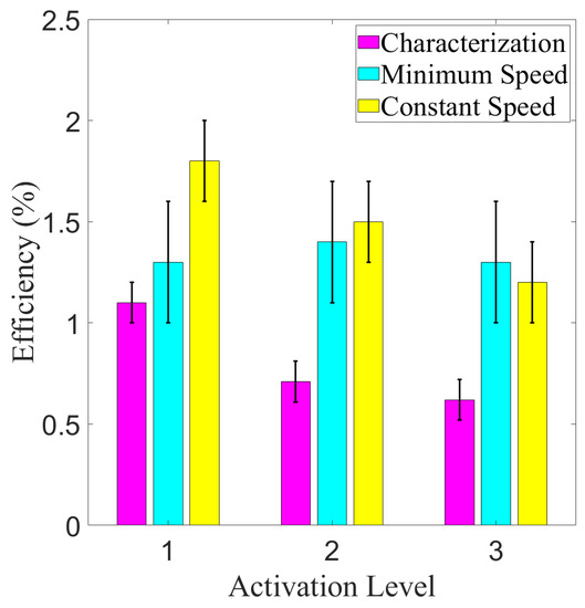 Efficiency of the actuator during isotonic contractions compared to activation level, for the stroke characterisation experiment, minimum contraction period experiment, and constant contraction period experiment. Significance in differences not displayed due to inapplicability.