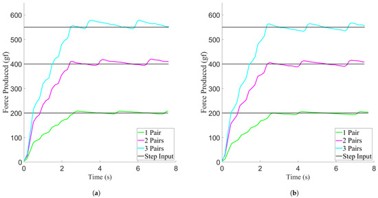 After finding these values, a simulated experiment was performed using the calculated relationships. A simulated step input was created such that the power was held to 80 W per activated level until the temperature, calculated using Equation (4) with values from Table 7, was able to increase from 25 °C to 85 °C, and then set to zero until the temperature was able to cool to 30 °C, creating a simulated version of the temperature curve from the minimum contraction period experiment. Similarly, a simulated version of the temperature–force curves found in the force characterisation experiment were created for each activation level across the same temperature span. These sets of pairs of curves were then input into the System Identification Toolbox in MATLAB, which derived the power–temperature transfer functions and the temperature–force transfer functions for each activation level, as shown in Table 8.