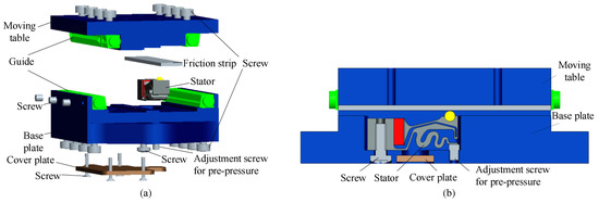 Configuration of the stage. (a) Structural explosion diagram of the stage. (b) Side view of the stage.