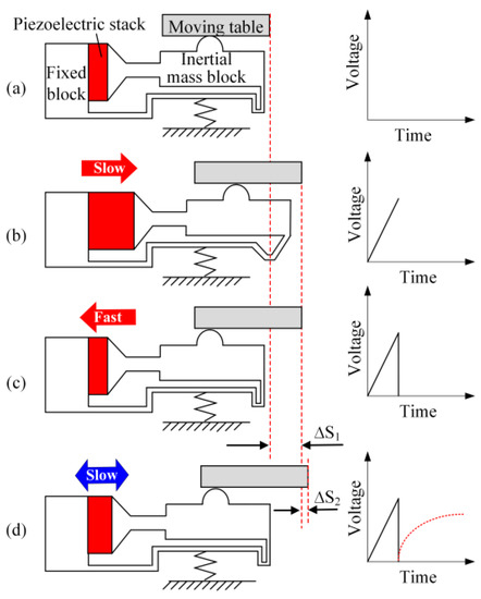 The operation principle of the proposed actuator is described in Figure 3. The piezoelectric stack changes its length proportionally to the applied voltage. The moving table will follow the movement of the piezoelectric stack with the same acceleration when the piezoelectric stack is not accelerated too high; this state is called stick-phase (see Figure 3b). Correspondingly, the inertial force of the accelerated motion table is higher than the friction force if the piezoelectric stack is accelerated very high. In this case, the friction surface of the actuator slips over the surface of the motion table, and as a result, the piezoelectric stack can change its length while the moving table stays its position, which is called the slip-phase (see Figure 3c). Thus, a continuous motion can be realized by repeating the sequence from Figure 3a–c. In order to achieve a high motion accuracy, a special operation mode called scan mode can be realized by slowly elongating the piezoelectric stack during the stick-phase (see Figure 3d).
