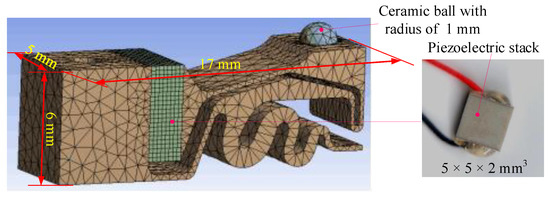 Here, 65Mn was selected as the material of the metal elastic body (density is 7820 kg/m3, elasticity modulus is 2.11 × 1011 Pa, and Poisson’s ratio is 0.288), and one ceramic ball made of Al2O3 was used as a friction ball (density is 3950 kg/m3, elasticity modulus is 3.55 × 1011 Pa, and Poisson’s ratio is 0.27). One PZT stack (NAC2003, Noliac Company, Kvistgaard, Denmark, density is 7650 kg/m3, elasticity modulus is 0.9 × 1011 Pa and Poisson’s ratio is 0.3) was chosen as the piezoelectric component, which had a size of 5 × 5 × 2 mm3, output displacement up to 2.6 μm at 60 V, and stiffness up to 350 N/µm. The finite element model of the actuator is shown in Figure 4.