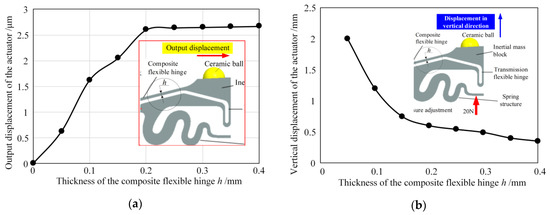 Influence of the composite flexible hinge thickness on (a) output displacement of the actuator and (b) vertical displacement of the inertial mass block.