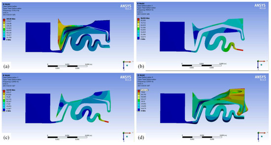 According to the working principle, in order to prevent the elastic metal element of the actuator from being excited to resonance state when the piezoelectric stack is excited, it is necessary to conduct modal analysis on the actuator without a piezoelectric element. Figure 6 shows the model analysis results. The natural frequencies of the first mode to the fourth mode are 7376 Hz, 9666 Hz, 12,440 Hz, and 12,538 Hz, respectively. It is clear that if the inherent modes shown in Figure 6 are excited, the elastomer of the actuator will produce undesirable deformation, resulting in abnormal operation or damage of the actuator. Therefore, the operating frequency of the actuator must be less than 7376 Hz, or between the above and subsequent model frequencies.