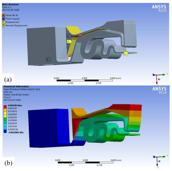 Here, the constraint of the fixed block is set as a fixed constraint. The end of the spring structure is in contact with the pre-pressure adjusting screw, so the only movement in the driving direction is allowed at the end of the elastic element. Thus, when a force of 50 N along the driving direction is applied to the end face of the composite flexible hinge, the inertial mass block produces a displacement of 91.5 μm along the driving direction. Then, the stiffness of the transmission flexible hinge in the driving direction is 50 N/91.5 μm = 0.546 N/μm, which is much less than the stiffness of the adopted piezoelectric stack (350 N/μm). Hence, at this stiffness level, the actual output displacement of the actuator is approximately the output displacement of the piezoelectric stack. Generally, the preload should be high enough, but not too high, to avoid depolarization. Thus, we choose 10% of the maximum output force of the piezoelectric stack as its pre-load. Here, the maximum output force of the adopted piezoelectric stack is 1050 N, so the pre-load of the stack should be about 100 N, and the mounting space of the piezoelectric stack should have a pre-deformation of about 0.18 mm (100 N/0.546 N/μm).