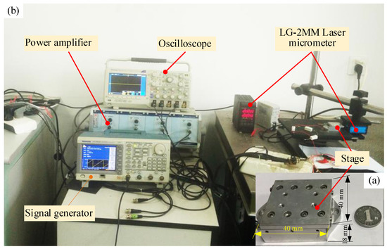 The prototype of the motion table driven by the proposed actuator was fabricated as shown in Figure 8a. The overall size of the motion table was 40 × 40 × 18 mm3, with a mass of about 32 g and a maximum stroke of 22 mm. A test system was built to measure the performance of the motion table, as shown in Figure 8b. One signal generator (AFG3022C, Tektronix Co., LTD. Suzhou, China) was utilized to produce a driving signal and amplified by a power amplifier to drive the actuator, and one oscilloscope was used to monitor the change of the driving signal. The dynamic and static characteristics of the stage were investigated by using a laser micrometer (LG-2MM, KEYENCE CORPORATION, Shanghai, China) with a measuring range of 2 mm; the maximum measuring range can be up to 10 mm with a different probe.