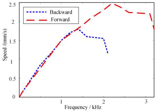 To solve this problem, the discharge circuit was used to improve the response characteristics of piezoelectric elements and achieved good results [28]. Therefore, we also developed a driving circuit with a discharge loop to improve the response characteristics of this proposed actuator and achieved the desired results (see Figure 10). Figure 10 shows the speed characteristics of the stage under different driving frequencies. Here, a series of sawtooth wave signals with an amplitude of 60 V, frequencies of 0~1000 Hz, and a step time of 30 ms were adopted to drive the actuator. The sampling frequency of the laser micrometer was set to 5 kHz. Both the forward and backward speed of the stage changed linearly with the driving frequency when the driving frequency changes from 0 to 1 kHz; however, when the driving frequency was above 1 kHz, the reverse speed increased slowly and reached its maximum speed of 1.8 mm/s at 1.4 kHz and the forward speed reached its maximum speed of 2.5 mm/s at 2.2 kHz. The main reason for the difference was that the push–pull performance of the actuator was not completely symmetric due to the differences between the elongation and contraction characteristics of the piezoelectric stack.