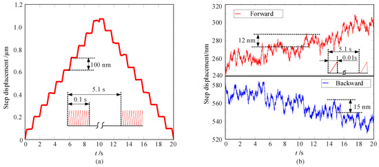 To achieve precise motion, the stepping operation mode of the actuator is usually used. By controlling the number of the driving signal, different resolutions can be obtained. Figure 11 presents the stepping test results of the stage in open-loop operation mode. Here, the driving signal is a sawtooth wave with a frequency of 100 Hz, and voltage amplitude of 2.2 V. Driven by a signal train of 0.1 s (driving signal cycle number is 10) for a driving period of 5.1 s, the finest resolution of 100 nm was achieved (see Figure 11a). Driven by a signal train of 0.01 s (driving signal cycle number is 1) for a driving period of 5.1 s, the finest resolution of 12 nm was achieved (see Figure 11b). There is a slight difference in the step displacement between the forward and backward directions. The reasons are mainly in addition to the asymmetric push–pull performance of the actuator; there are slight differences in the surface quality of the friction interface between the ceramic ball and the friction plate bonded on the motion table.