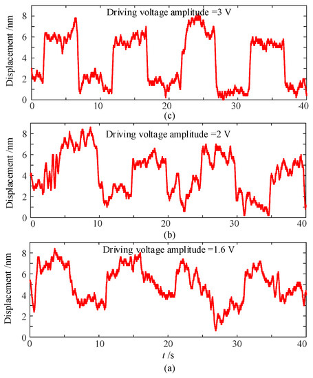 As described in Section 2, there are two operation modes of the proposed actuator: stick-slip mode and scan mode. As the described operation principle of the actuator, in stick-slip mode, the actuator is driven by the mode of the piezoelectric stack’s fast stretch and slow shrink, or slow stretch and fast shrink, which is used to achieve continuous motion over a long distance; in scan mode, the actuator is driven by slowly elongating the piezoelectric stack, which is used to achieve high precision motion within a small displacement. Therefore, the resolution test was carried out to study the minimum displacement output of the stage operated in scan mode. Here, the square wave signal was selected as the driving signal to measure the resolution. To clearly observe the movement of the stage, the period of the square wave was set to 10 s. The voltage amplitude of the drive signal started from 0 V and increased at intervals of 0.2 V. The results show that the displacement response of the stage exhibited a discernible square waveform until the voltage value reached 1.6 V (see Figure 12a); however, the displacement resolution was difficult to predict. When the driving voltage was 2 V, the displacement resolution of 4 nm could be recognized (see Figure 12b). When the voltage reached 3 V, the displacement curve was mostly like the square waveform with a resolution of 5 nm (see Figure 12c).