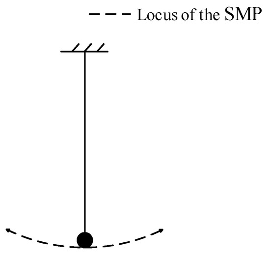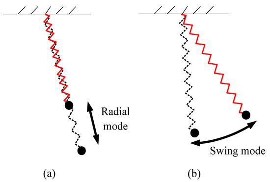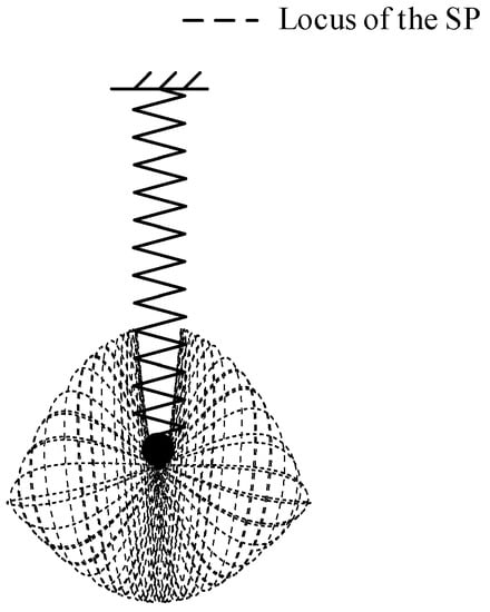 The SP can be regarded as a modified SMP, which replaces the suspending cable with a linear spring. In previous studies [45,71,72], the motion equation of the SP has been derived to analyze its behavior. Suppose the original length and the stiffness of the spring are and , respectively. When the mass is subjected to gravity, length of the spring will be stretched to (as shown in Figure 2):