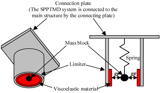 Though previous studies also demonstrate that its energy absorption ability of the SP is larger compared to the suspended mass pendulum, because the SP has an additional radial vibration mode [45], the energy dissipation capacity of the SP is still insufficient. Therefore, this paper incorporates the collision into the SP. As seen in Figure 5, the SPPTMD system consists of a connection plate, a mass block, a spring and a limiter with the built-in viscoelastic material. Among these components, the connection plate is employed to connect the SPPTMD system to the main structure, while the spring pendulum and the limiter are used to absorb the vibration energy; additionally, the viscoelastic material is applied to reduce the noise generated when the mass collides with the limiter, to avoid local damage of the limiter and to increase the energy consumption during collision. The vibration suppression principle of the SPPTMD system is as follows: (i) when the vibration of the primary structure is small, the mass of the SPPTMD absorbs the kinetic energy of the primary structure as a typical SP; (ii) when the vibration of the primary structure exceeds a certain level, the added mass collides on the limiter and dissipate the absorbed kinetic energy.