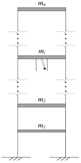 Based on Equations (8)–(16), the equations of motion for an n-degree-of-freedom structure equipped with an SPPTMD attached to the ith degree of freedom can be derived as follows: