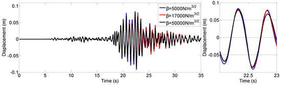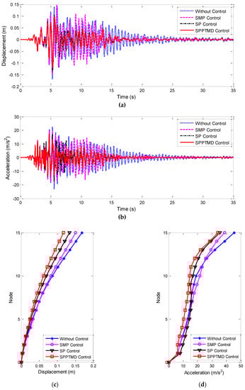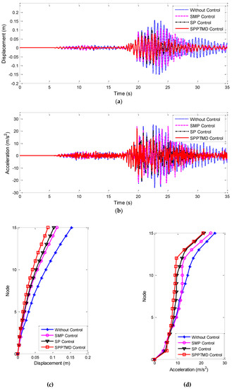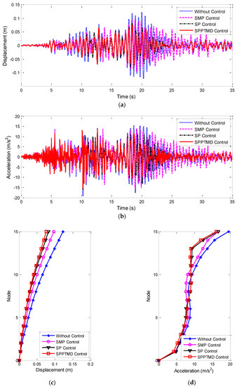 In this paper, three recorded ground motions are chosen according to Chinese Code for designing transmission tower structures [74], to verify the effectiveness of the proposed SPPTMD, with their peak acceleration adjusted to 400 cm/s2. The detailed information of the selected seismic records is shown in Table 1. Afterward, the damping performance of an SMP, an SP and an SPPTMD with the same mass ratio are compared. The following parameters are assumed for the numerical study: the mass ratio is 2%, the damping ratio is 2%, = 17,000 N/m3/2, gp = 0.05 m. The seismic responses of the tower under the various earthquake waves are shown in Figure 10, Figure 11 and Figure 12.